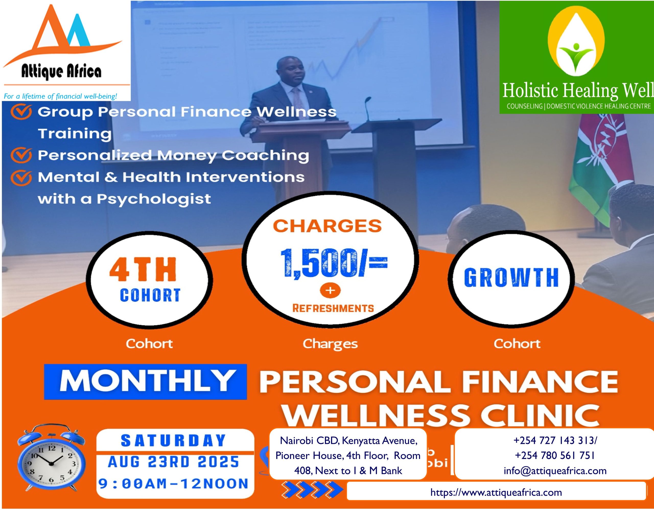 We are offering these affordable, flexible and life changing monthly Personal finance wellness Clinics & Empowerment initiative which targets individuals, couples, groups of employees, fellowships, Chama’s, Etc.